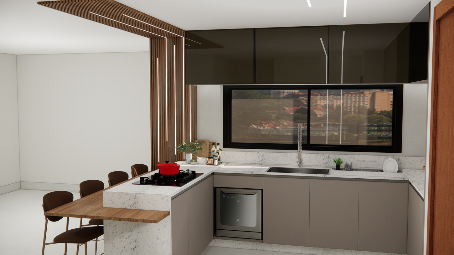 * Layout aberto e conectado à área social, permitindo que o anfitrião cozinhe sem perder o fio da conversa.